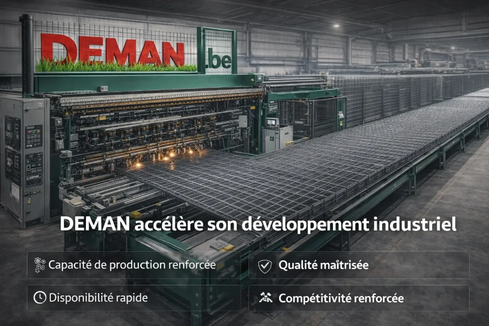 DEMAN Clôtures a acquis une ligne automatique de fabrication de panneaux rigides (ex-Clotex), bientôt installée avec sa production DEMAFIX. Cet investissement renforce production, qualité, disponibilité et compétitivité, consolidant sa position sur le marché.